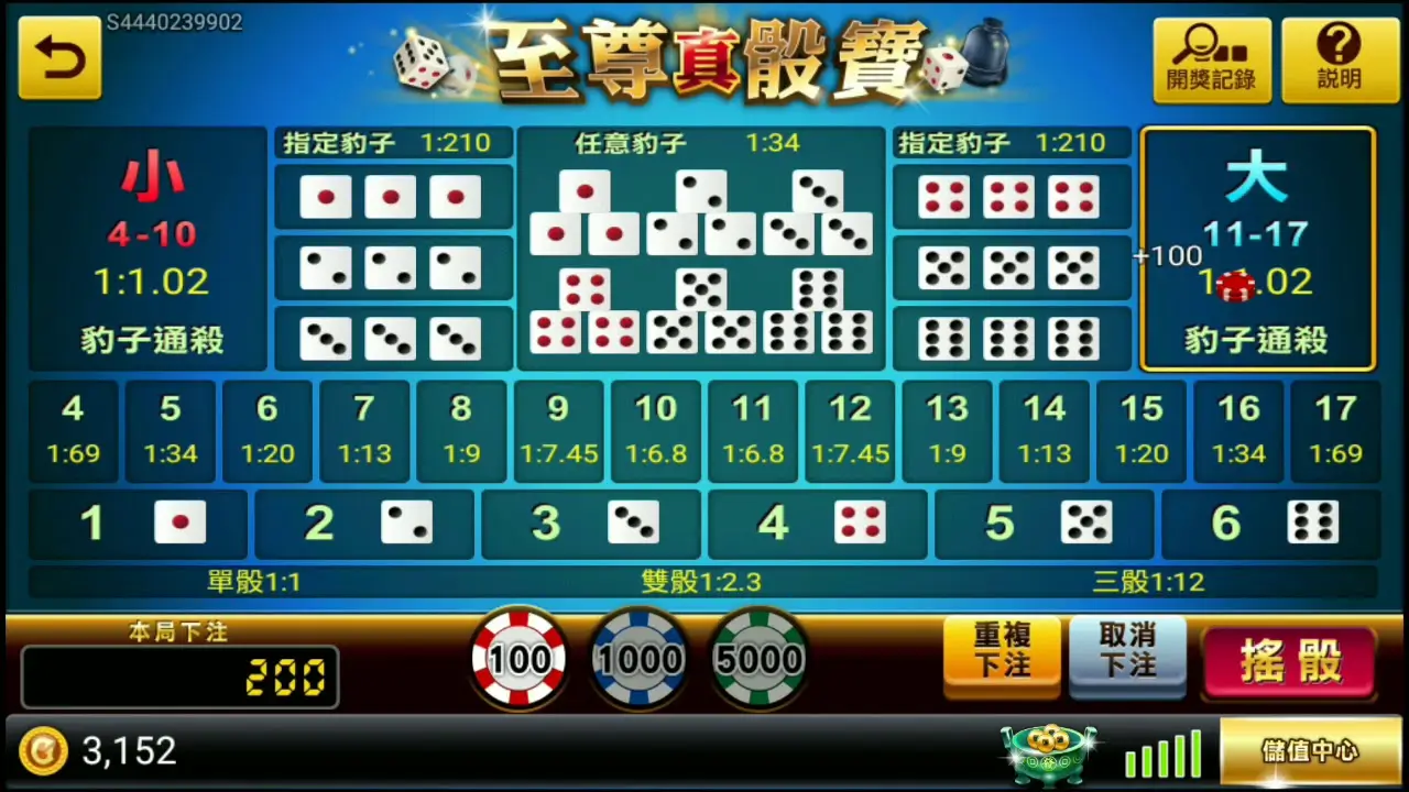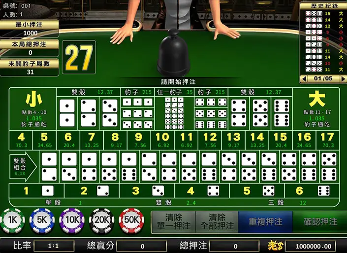 最经典的骰宝下注方式,猜测三颗骰子点数总和为大(11–17)或小(4–10)。
